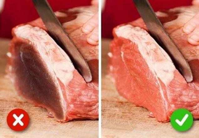 Büyük bir parçayı yarıya kesin: Et koyu fakat beyaz kontürlü ise ömrü katkı maddeleri ile uzatılmış demektir. Bir kağıt havlu ile kurulayın - taze et havlu üzerinde çok fazla nem ve kan bırakmamalıdır