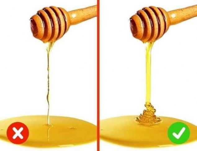 Bir yüzeye biraz bal koyun. Sahte bal damlar ve derhal yüzeyde yayılır.Yüksek kaliteli bal oldukça kalın ve ince bir akış halinde akar.