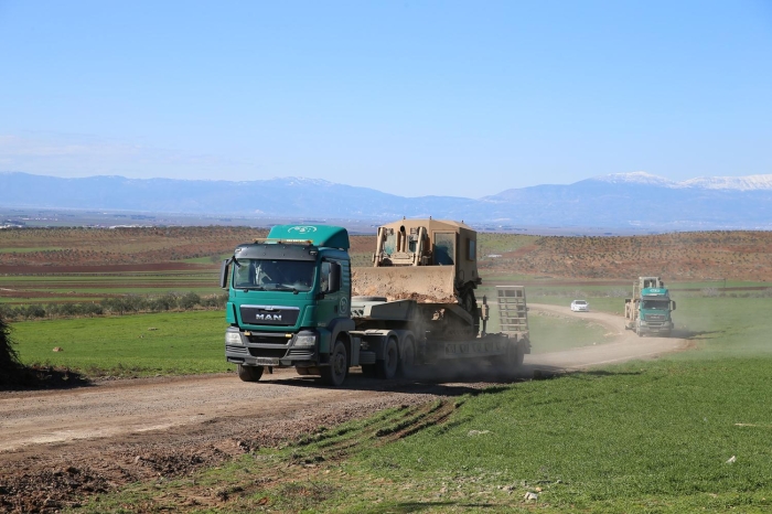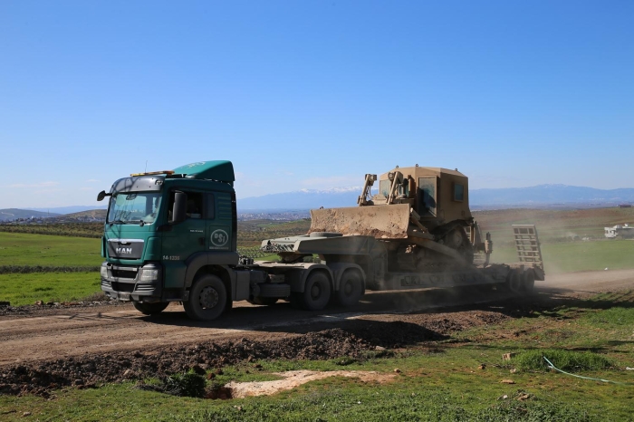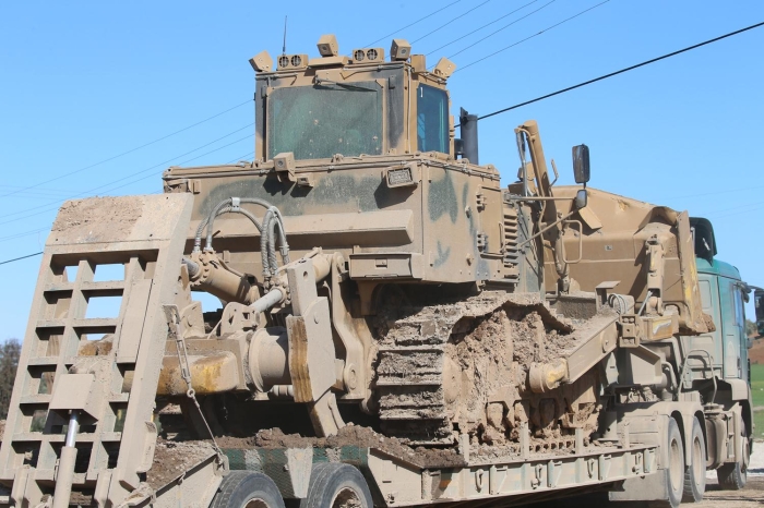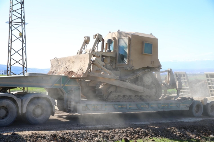 Türkiye'nin farklı birliklerinden gönderilen zırhlı loder iş makinelerinin yer aldığı askeri konvoy, Hatay'ın Reyhanlı ilçesine ulaştı.