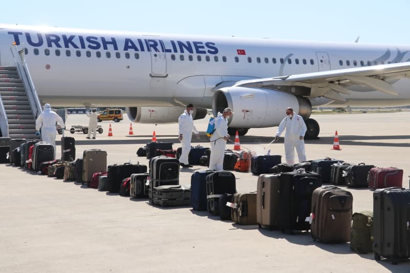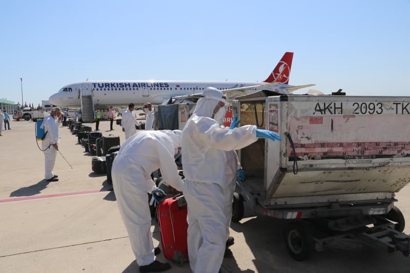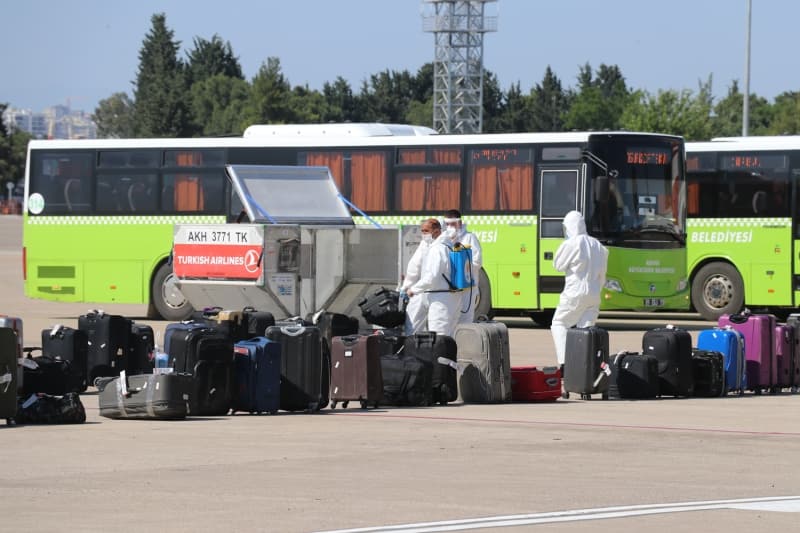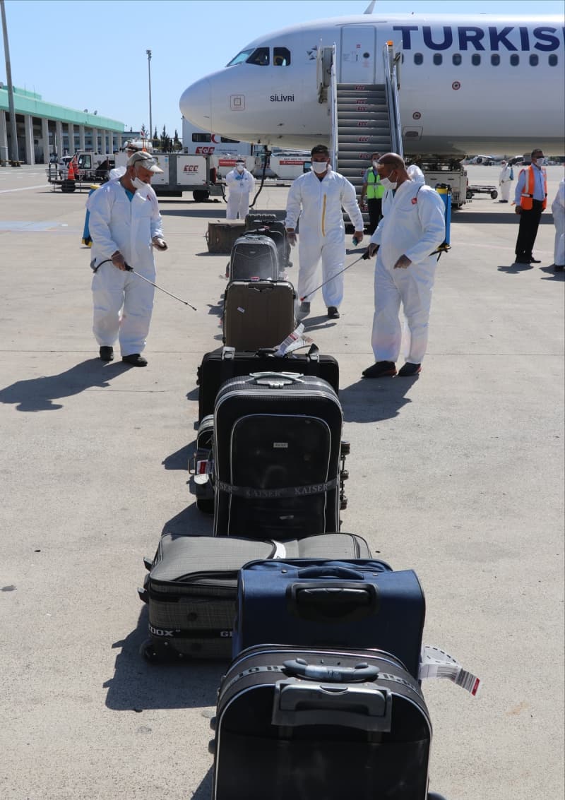 Dezenfekte edilen valizler aprona dizildikten sonra yolcuların pasaportları kontrol edildi.