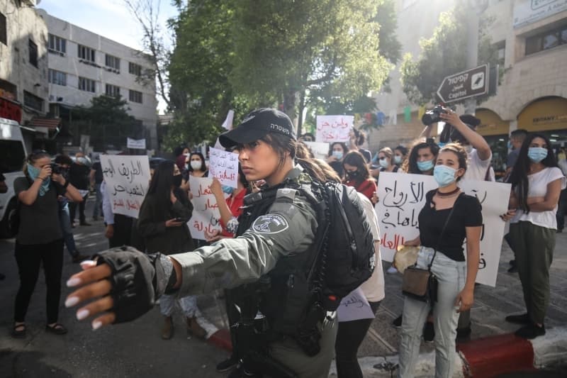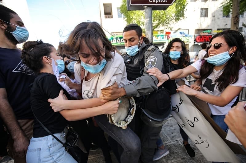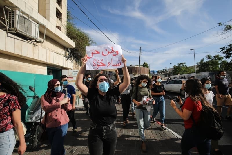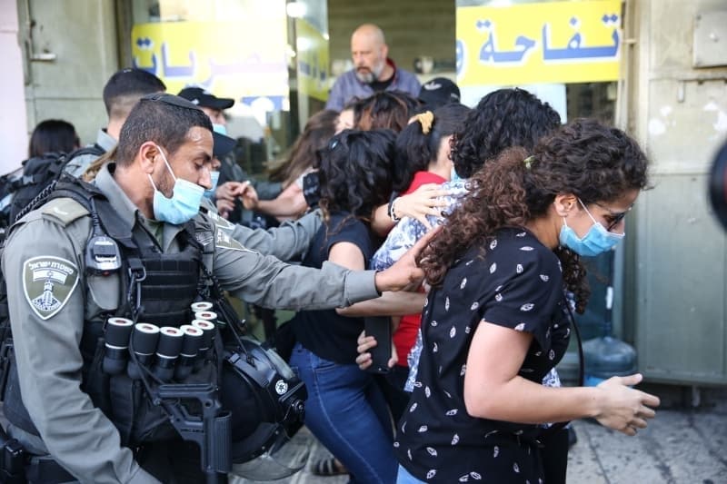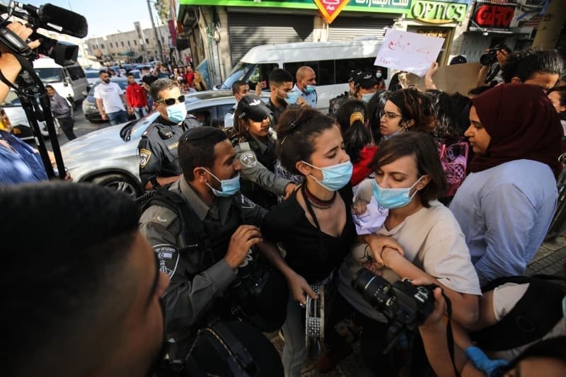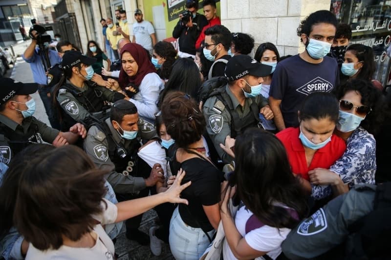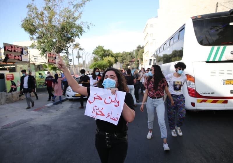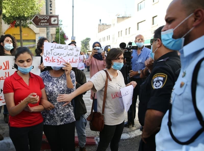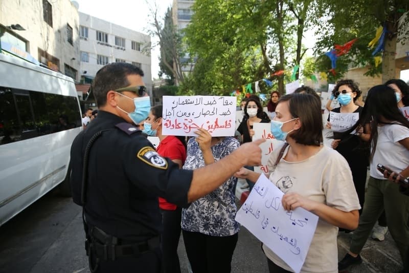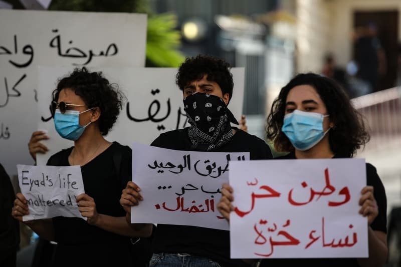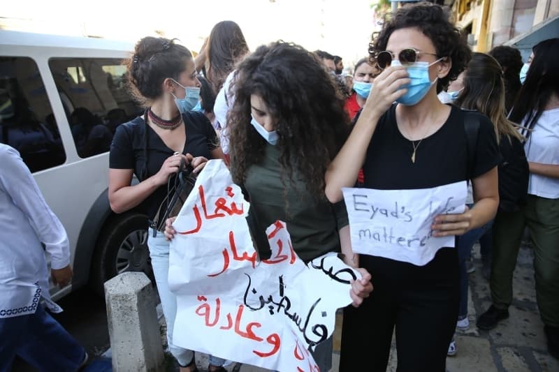 Doğu Kudüs'ün Selahaddin caddesi'nde toplanan bir grup Filistinli kadın aktivist, 32 yaşındaki otizmli İyad Hallak'ın İsrail polisi tarafından şehit edilmesi ve İsrail'in Filistinlilere yönelik ihlallerini protesto etti.