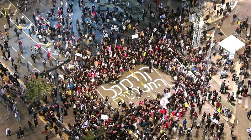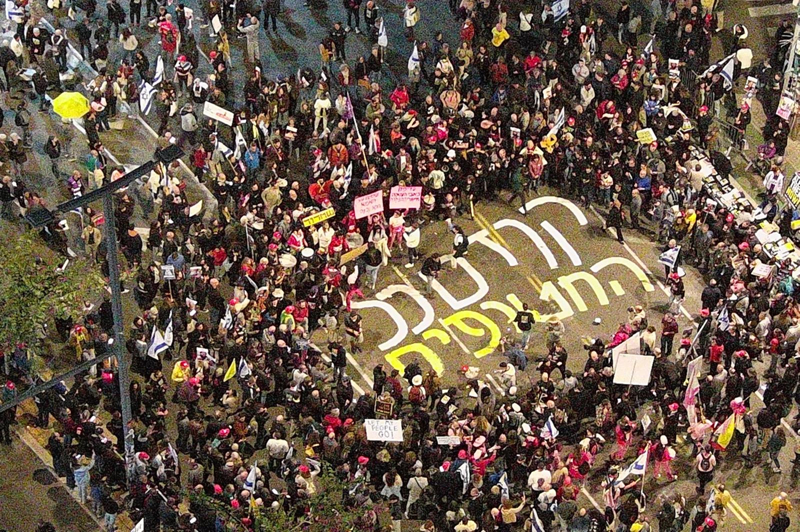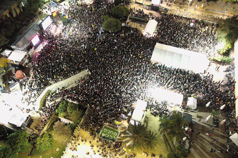 Göstericiler, meydanda İbranice 'önce rehineler' yazısı yazdı.