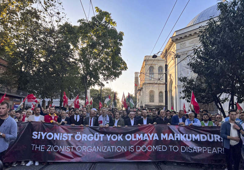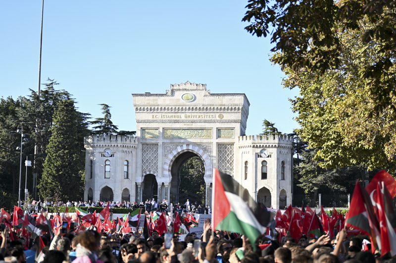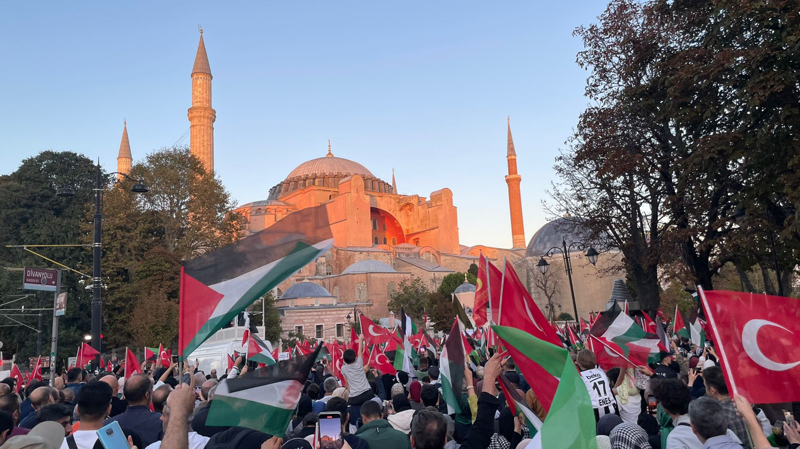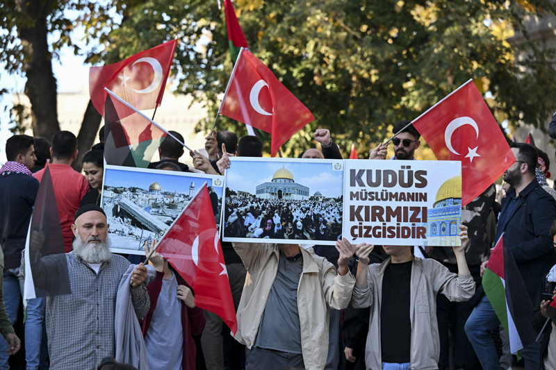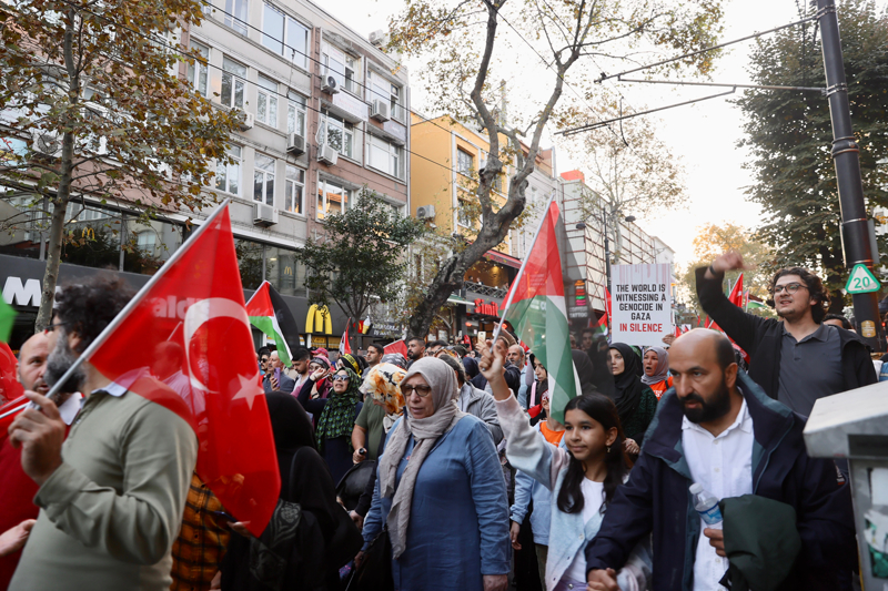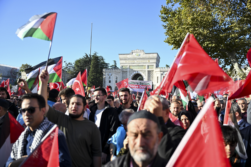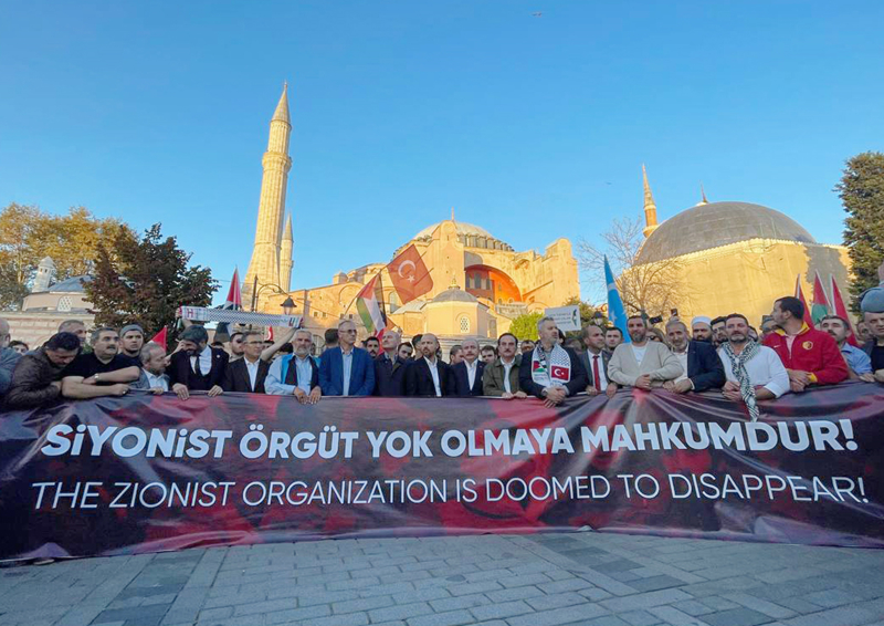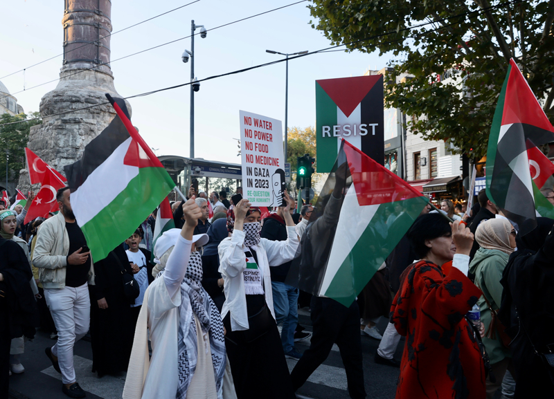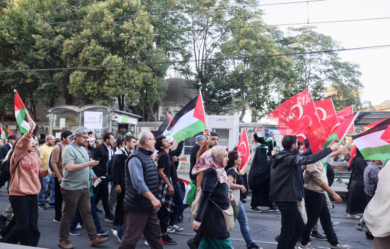 Eyleme katılanlar, Türkiye ve Filistin bayraklarının yanı sıra Filistin'e destek için çok sayıda Türkçe, İngilizce ve Arapça döviz ile pankart taşıdı.