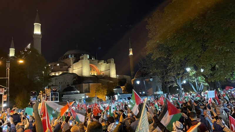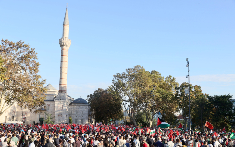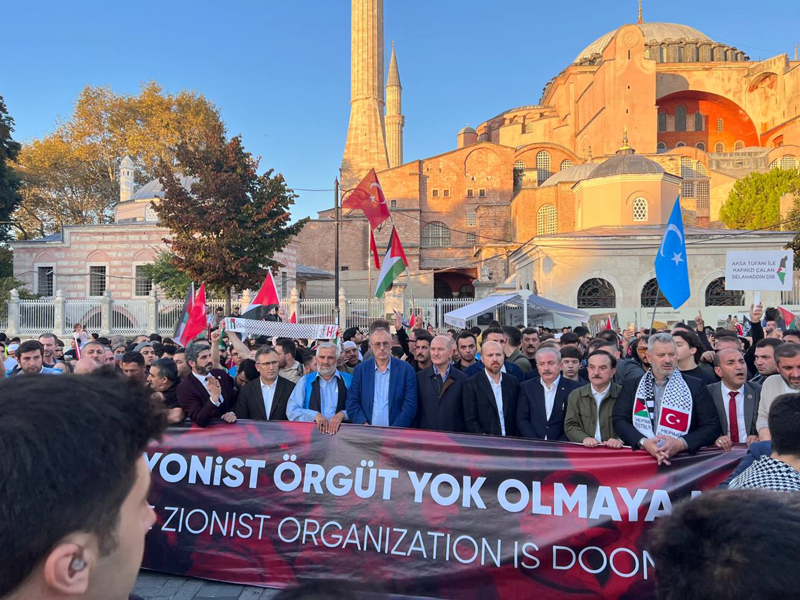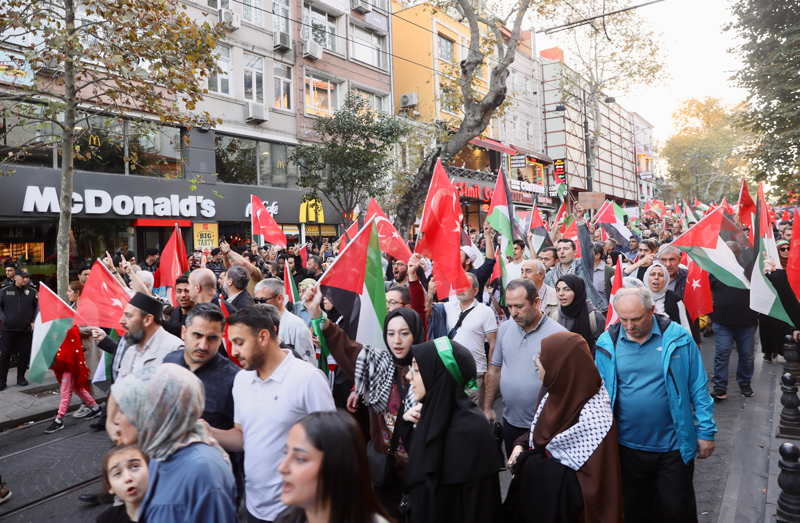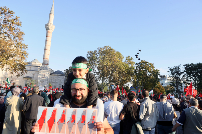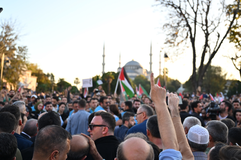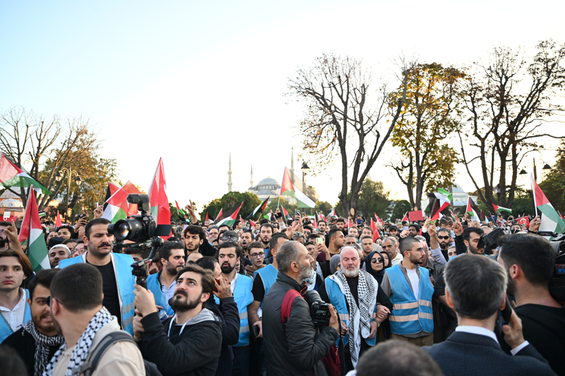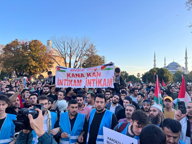 Meydanda toplanan gruplar, Filistin lehine çeşitli sloganlar attı. İsrail'in saldırılarına tepki gösteren gruptakiler, bu ülkeyi sloganlarla protesto etti.