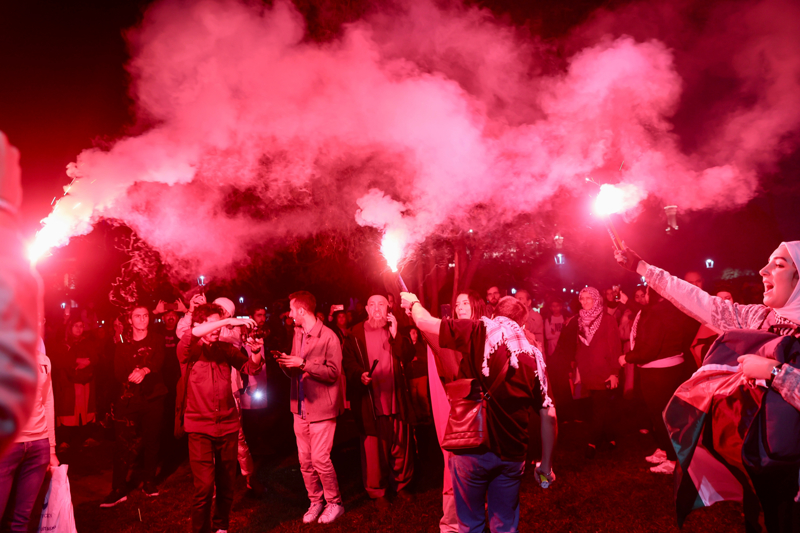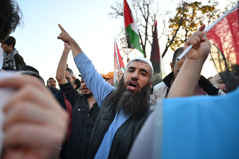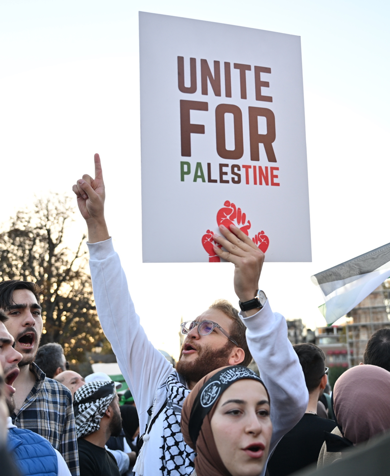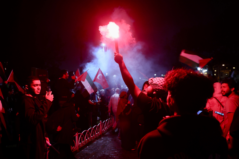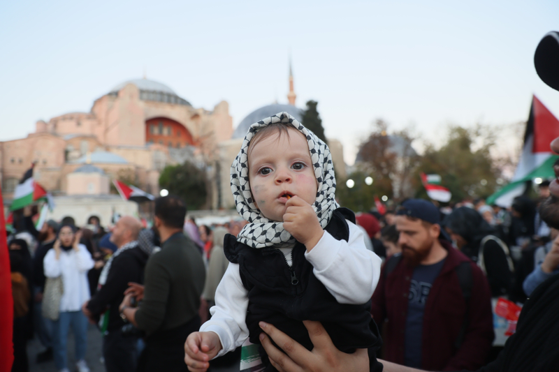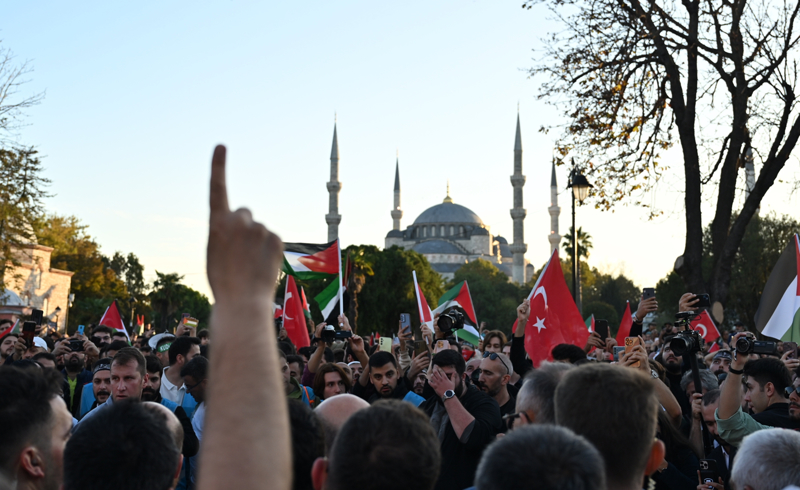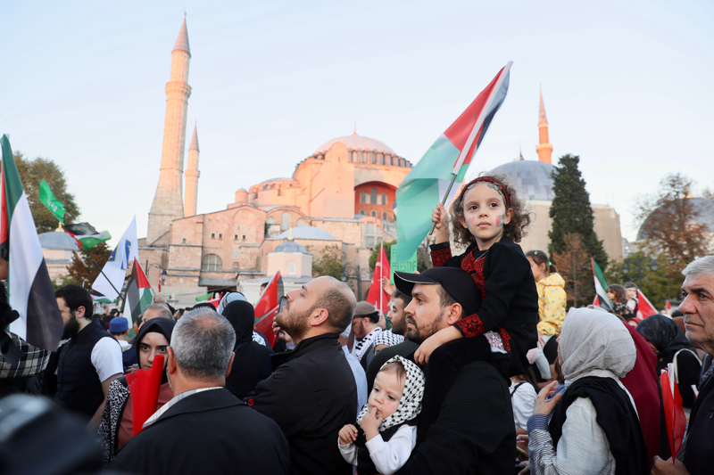 Meydanda toplanan gruplar, Filistin lehine çeşitli sloganlar attı. İsrail'in saldırılarına tepki gösteren gruptakiler, bu ülkeyi sloganlarla protesto etti.
