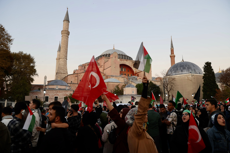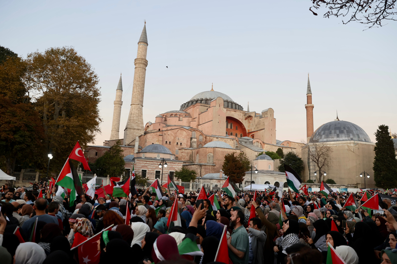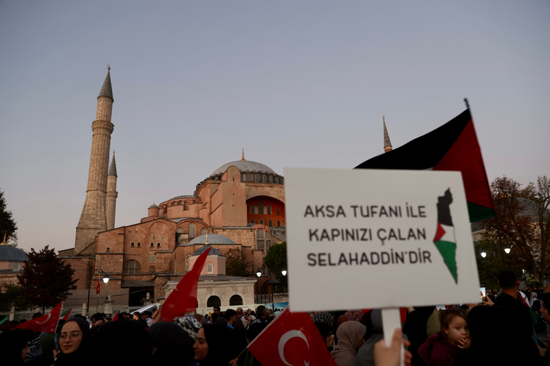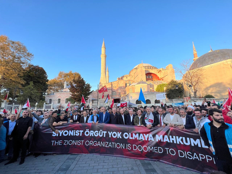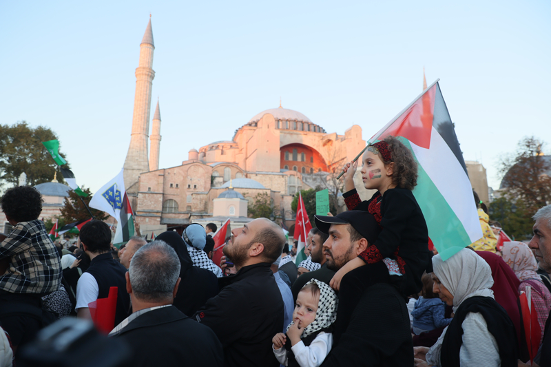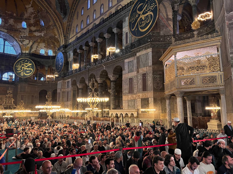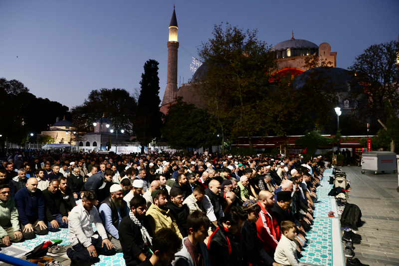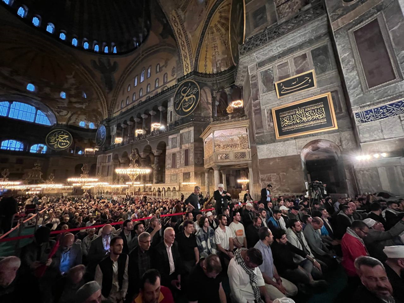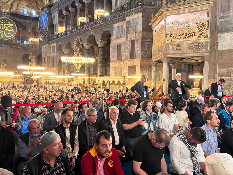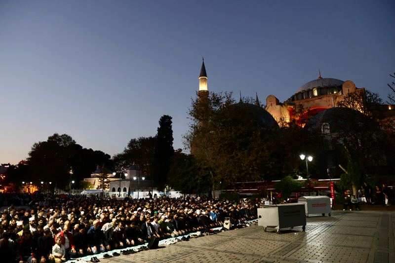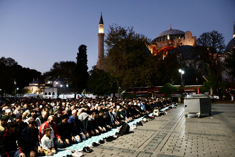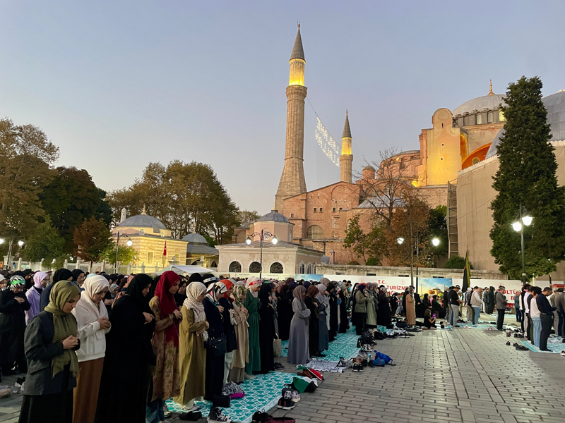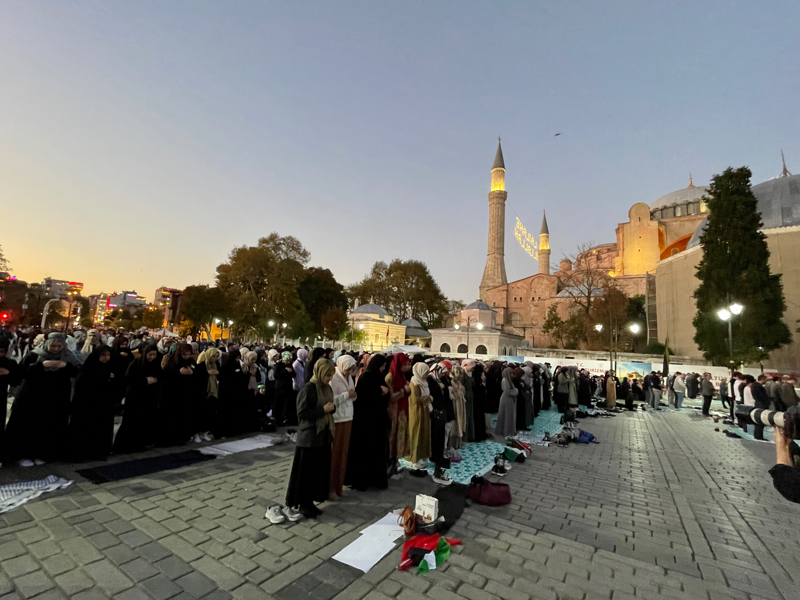Sloganlar eşliğinde Ayasofya Meydanı'na ulaşan grup, etkinliğin tamamlanmasının ardından Ayasofya-i Kebir Cami-i Şerifi'nde akşam namazı kıldı. Kalabalık nedeniyle camiye giremeyen bazı katılımcılar, namazlarını meydanda eda etti.