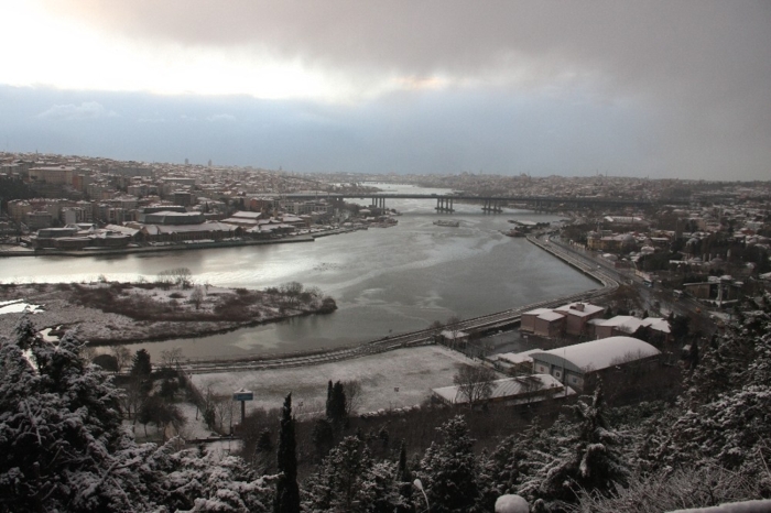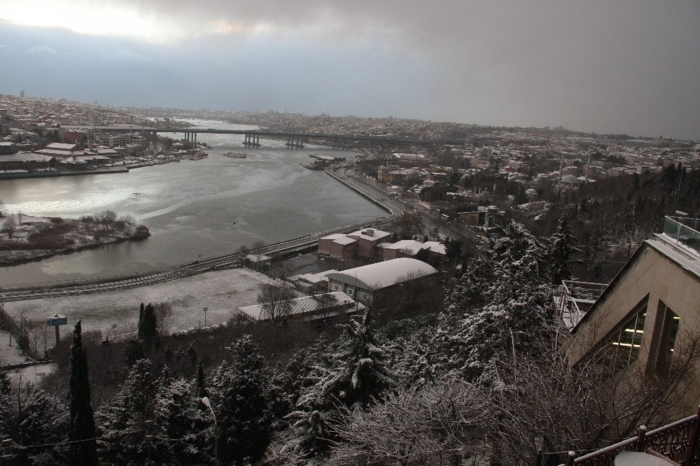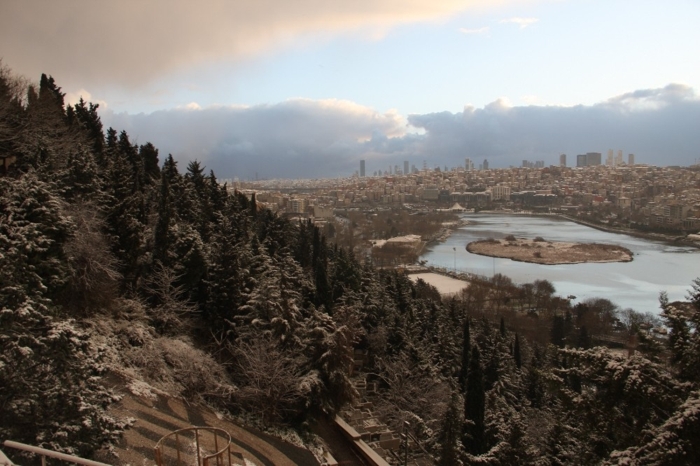Eşsiz İstanbul manzarası ile turistlerin uğrak yeri olan Pierre Loti Tepesi’nde yağan karla kartpostallık manzaraları oluştu.