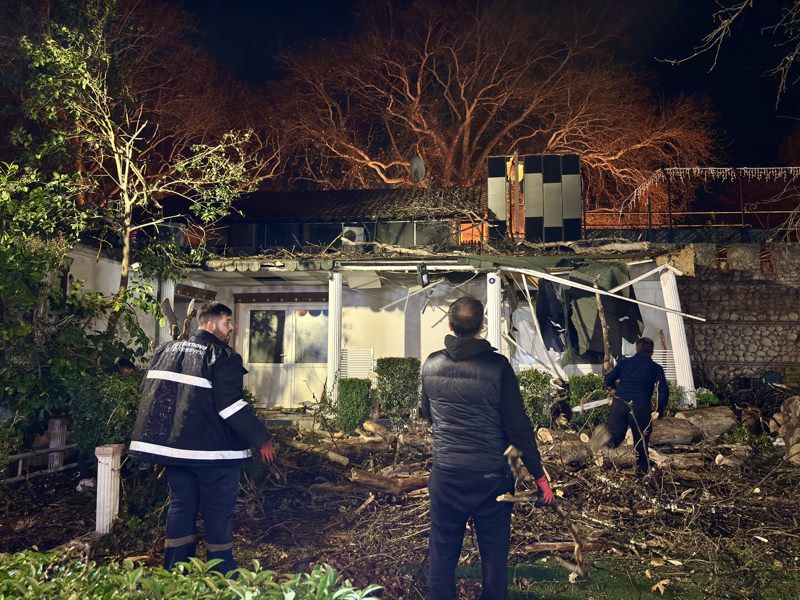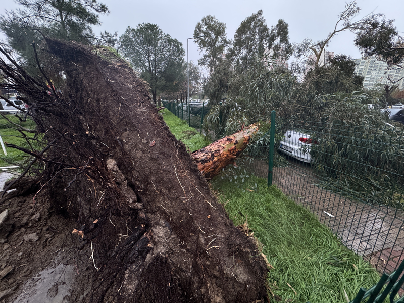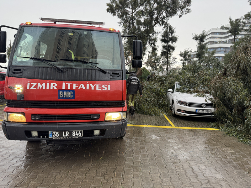 Karşıyaka'da Mavişehir Mahallesi 2040 Sokak'taki bir ağaç da kuvvetli rüzgar nedeniyle park halindeki araçların üzerine devrildi, araçlarda hasar oluştu.