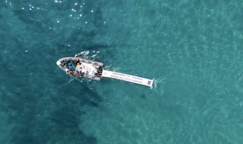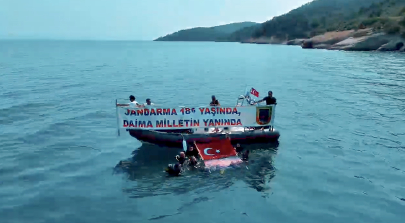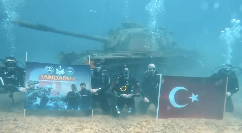 Jandarma Teşkilatının 186. kuruluş yıl dönümü dolayısıyla Saros Körfezi'nde batık tanka dalış yapan jandarma ekibi, su altında pankart açtı.