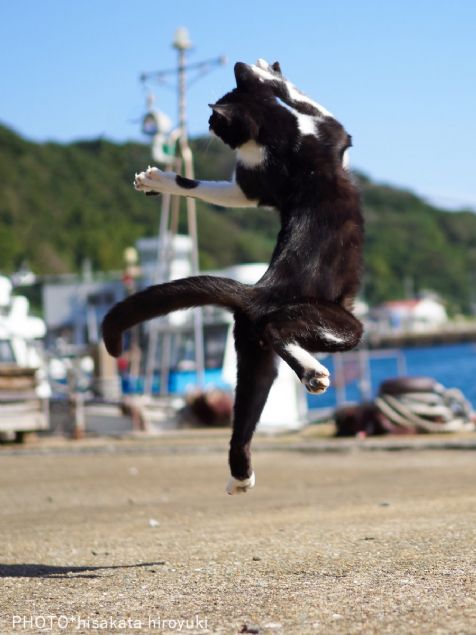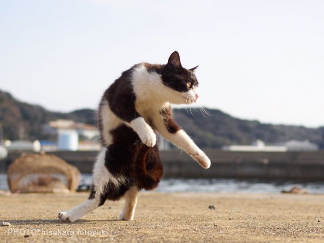 Hiroyuki, kedilerin bu refleksini yakalamak için yanında taşıdığı harekeli bir oyuncak ile bu fotoğraf karelerini kaydediyor.