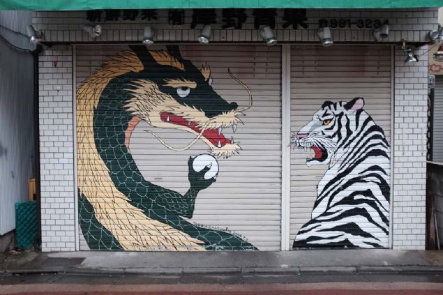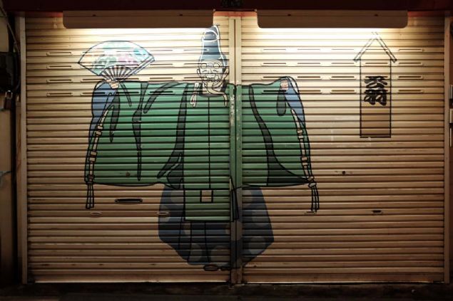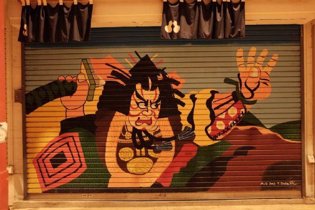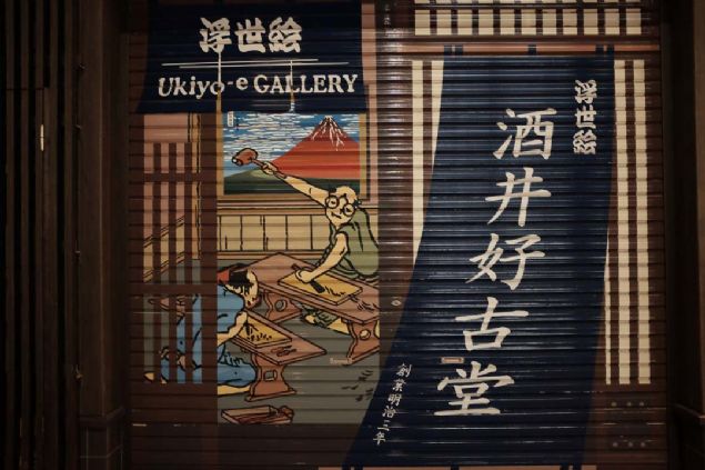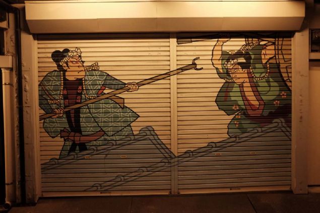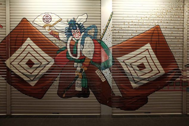 Japonya'nın başkenti Tokyo'da yoğun ziyaretçi çeken Asakusa bölgesinde, Japon tarihi ve kültürünü yansıtan birbirinden farklı modern ve geleneksel çizimler dükkan kepenklerini süslüyor.