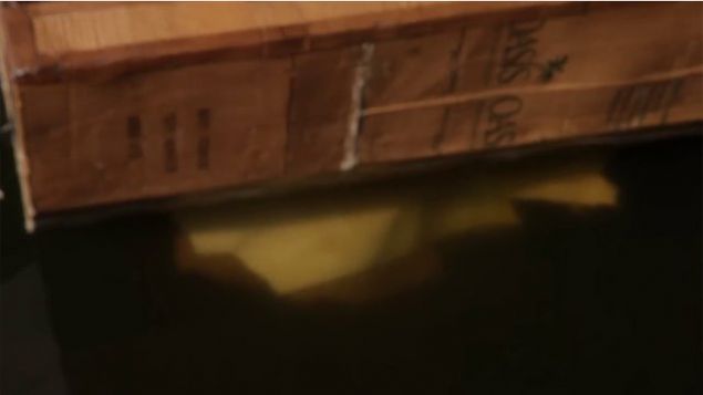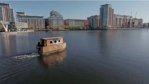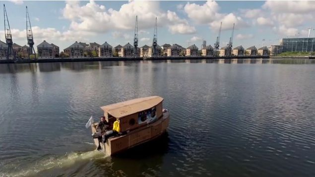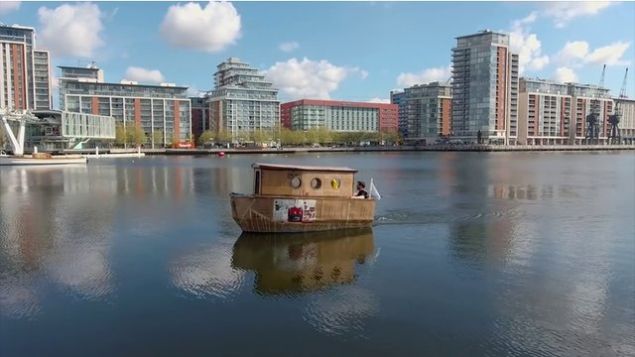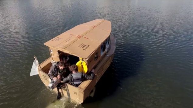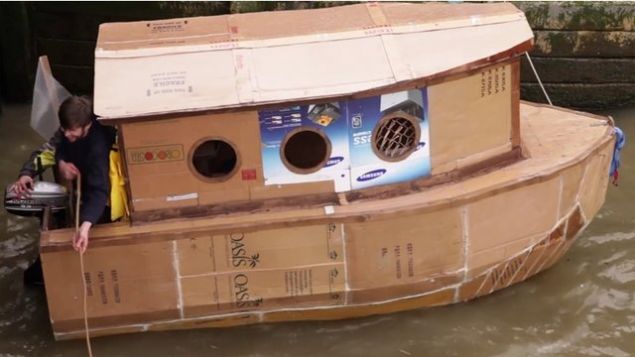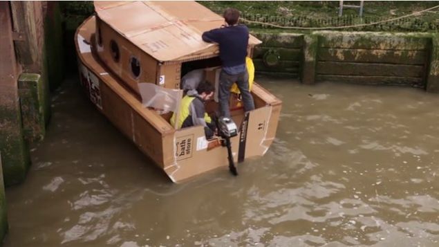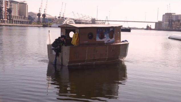 Tekne arkasına motor takan ikili su üstünde kısa süreli gezinti yaptı. Teknenin alt kısmındaki kartonların yavaşça açılmasıyla gezinti sona erdi.