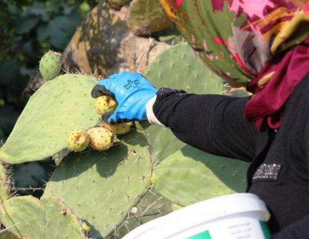 Yaz aylarında olgunlaşan kaktüslerden meyve veren, dikenli olması nedeniyle hasat sırasında özel dikkat gerektiren dikenli incir, genellikle sabah erken saatlerde toplanıyor.