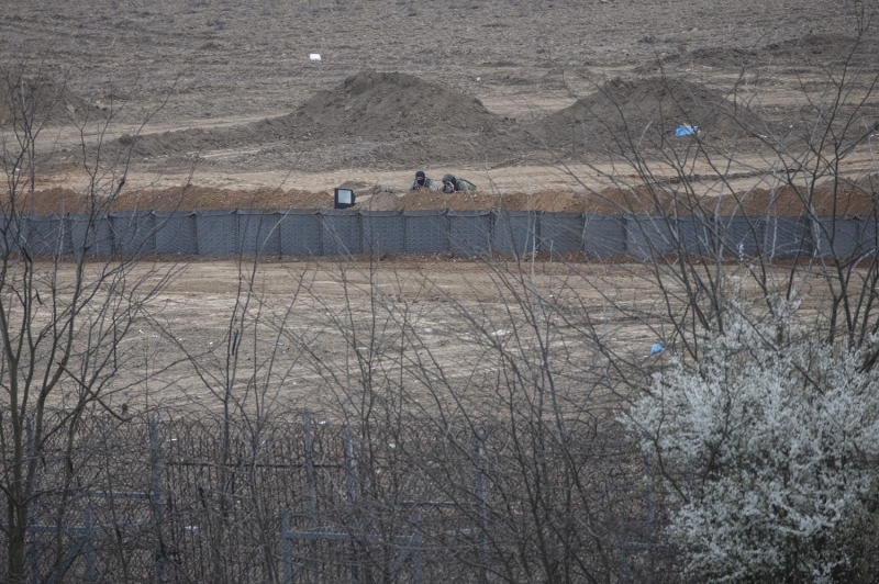 Yüksek sınır tellerinin gerisine yerleştirdiği kum torbalarının ardına siper kazmaya devam eden Yunanistan, burada beklettiği tüfekli askerlerle, sınır geçişlerini engellemeye çalışıyor.