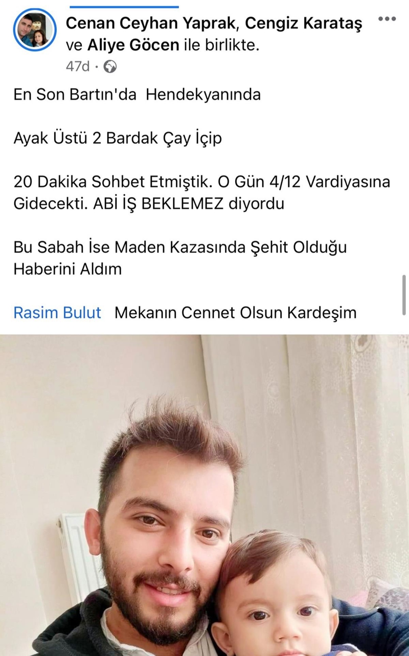 Hayatını kaybedenlerden Amasra'nın Kaman Köyü'nden Emrah Kaval'ın babası Hasan Kaval, sosyal medya hesabından oğlunun hayatını kaybettiğine ilişkin yazı paylaştı. Acılı baba Kaval, paylaşımında şu ifadeleri kullandı: 'Oğlum Emrah Kaval TTK müessesinde geçirdiği kaza nedeniyle vefat etmiştir. Bugün öğle namazına müteakip defnedilecektir.'