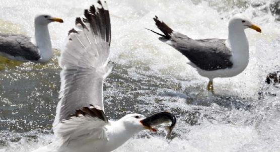 İnci kefalleri nesillerini devam ettirebilmek için yoğun çaba harcarken, martılar da karınlarını doyurmaya çalışıyor.