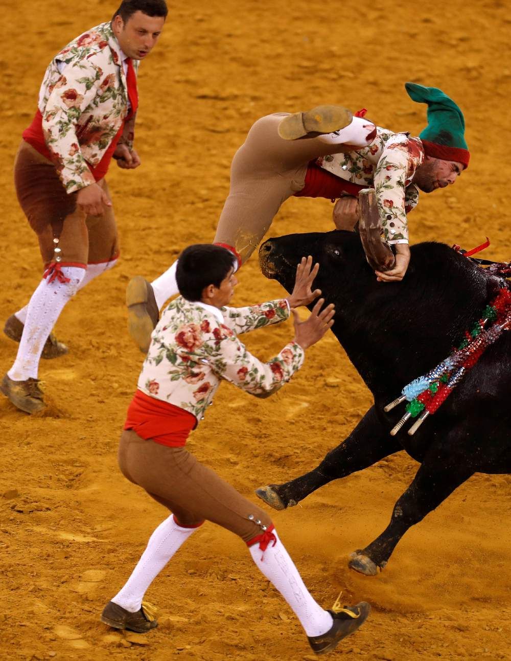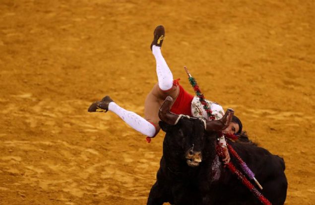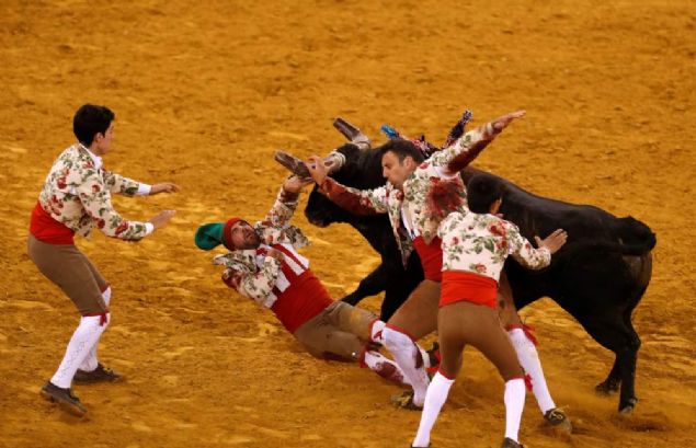 Portekiz Lizbon'da dün Campo Pequeno arenasında boğa güreşi sırasında matadorlar zor anlar yaşadı. Kızgın boğanın iki matadoru da moynuz darbesiyle yere serdiği anlar böyle görüntülendi.