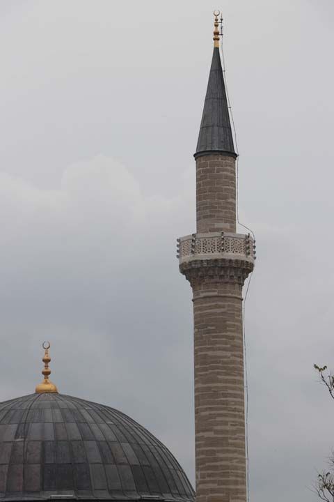 Kırılmış minare şerefe korkulukları sökülerek yeniden yapılan camide, minare tamamen temizlendi ve su itici sürüldü.