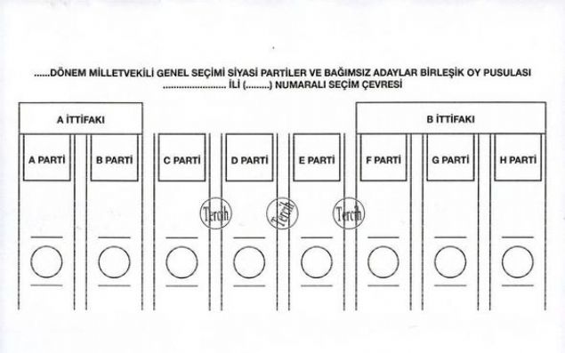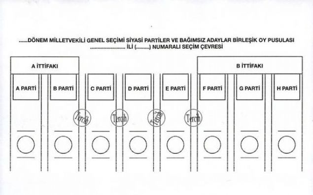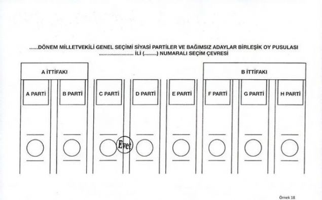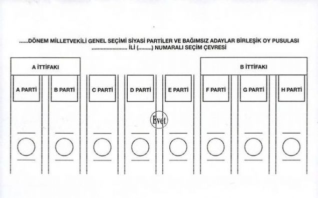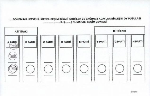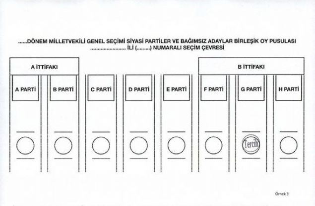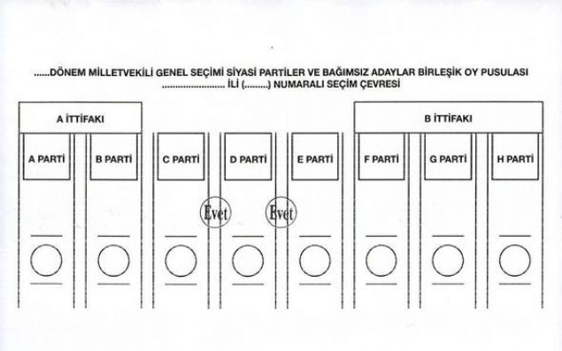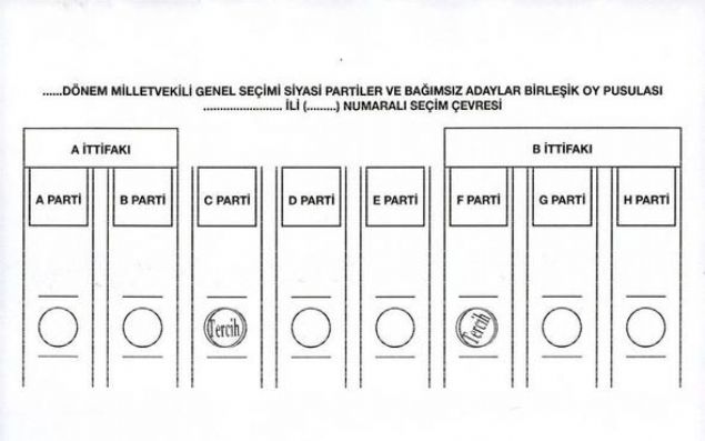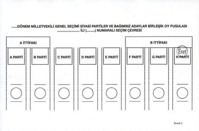 Yüksek Seçim Kurulunca (YSK), 24 Haziran'da yapılacak 27. Dönem Milletvekili Genel Seçiminde kullanılacak oy pusulalarında 'EVET' veya 'TERCİH' mühürlerinin basıldıkları yerlere göre ortaya çıkabilecek muhtemel sonuçları ve oyun geçerli geçersiz sayılmasına ilişkin durumları gösteren örnek oy pusulası şablonları hazırlandı.