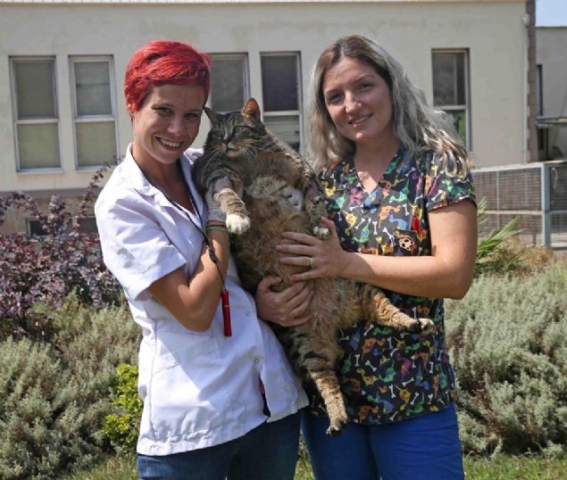Karşıyaka'da hayvanseverler tarafından sokakta bakılan ve aşırı kilosu nedeniyle yürüme güçlüğü çeken kedi, Karşıyaka Belediyesi Veteriner İşleri Müdürlüğü ekiplerince Taypark Polikliniği'ne getirildi.