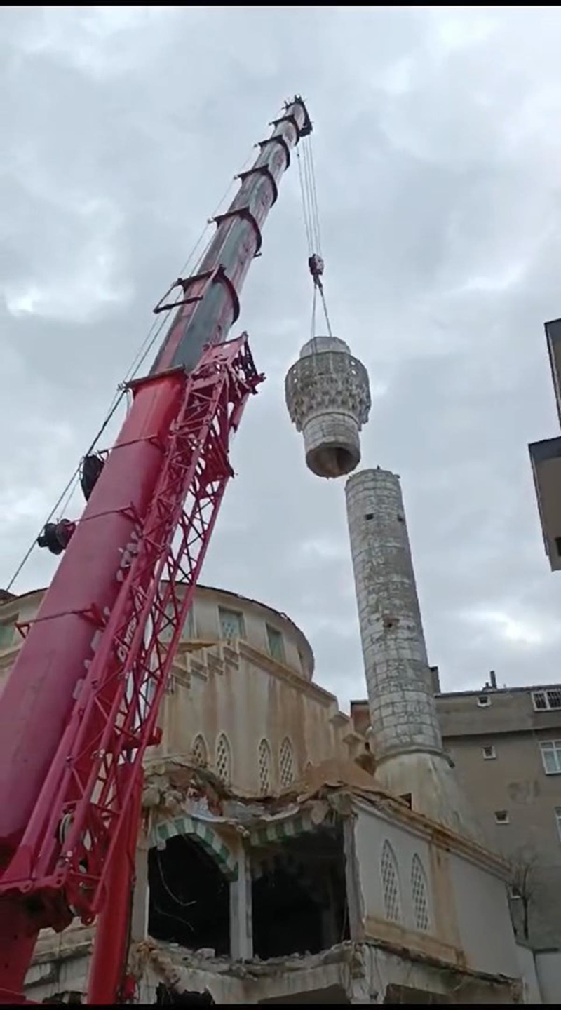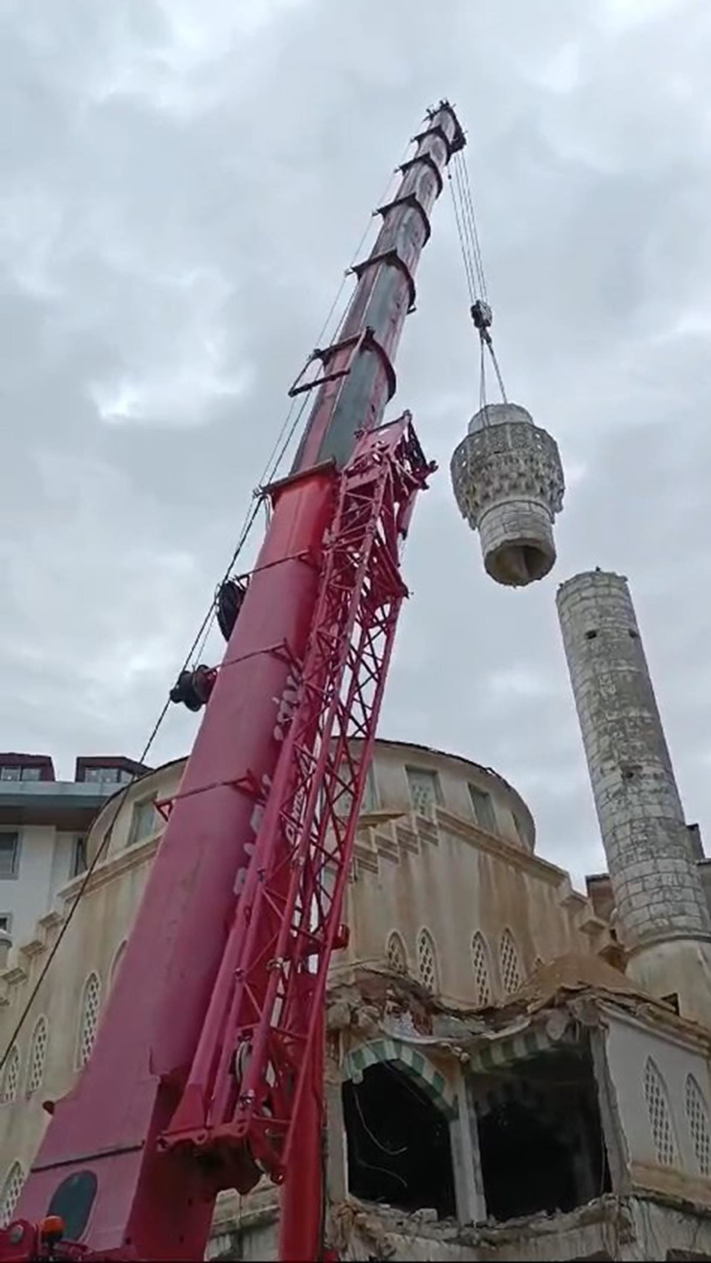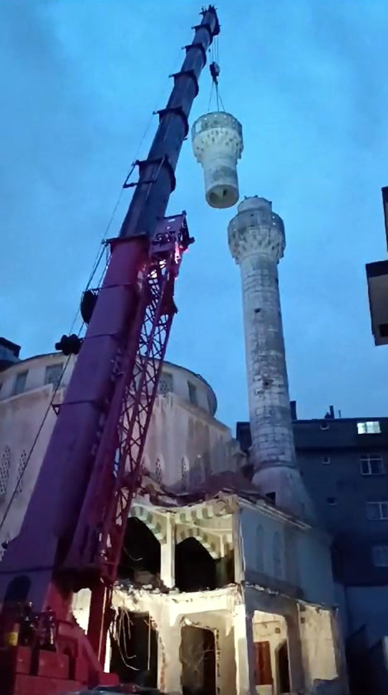 İş makineleriyle bir kısmı yıkılan caminin minaresini devirerek yıkmanın tehlikeli olabileceğini değerlendiren ekipler, minareyi keserek vinç yardımıyla almaya karar verdi.