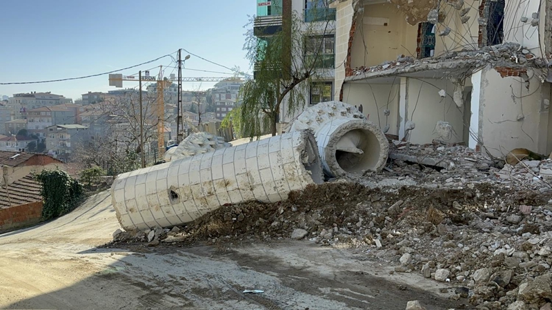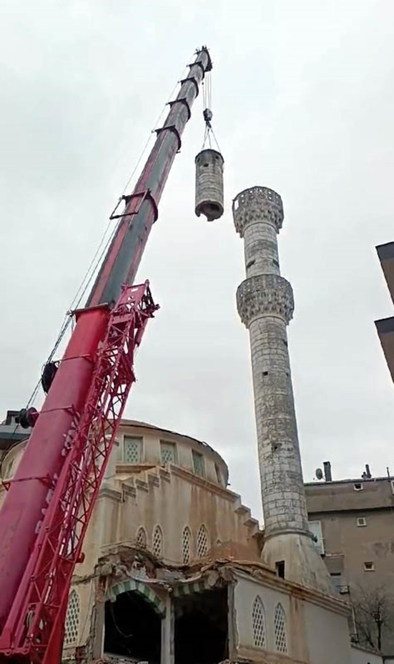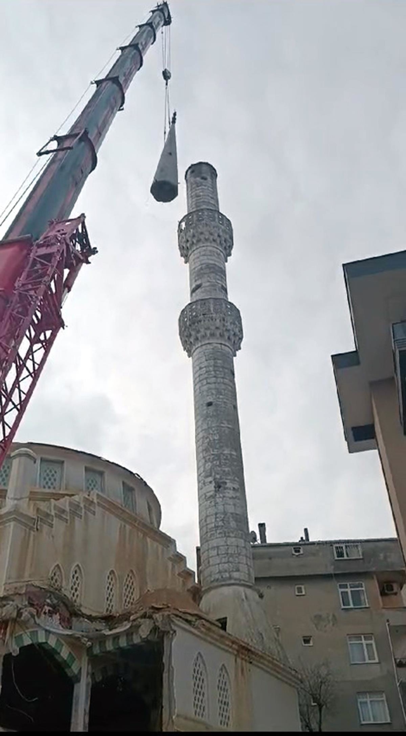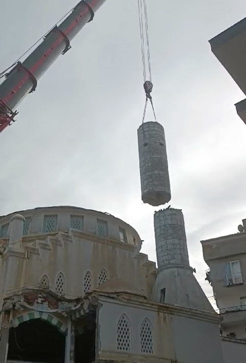 İş makineleriyle bir kısmı yıkılan caminin minaresini devirerek yıkmanın tehlikeli olabileceğini değerlendiren ekipler, minareyi keserek vinç yardımıyla almaya karar verdi.