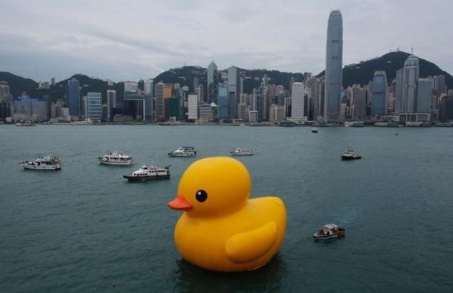 Hollandalı sanatçı Florentijn Hofman tarafından plastikten yapılmış dev ördek yavrusu