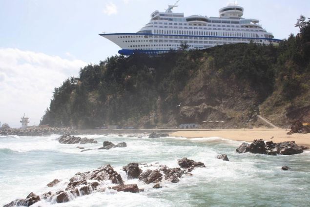 Karaya vurmuş bir gemi. Bu yolcu gemisi aslında Güney Kore'de özel bir tatil otelidir.