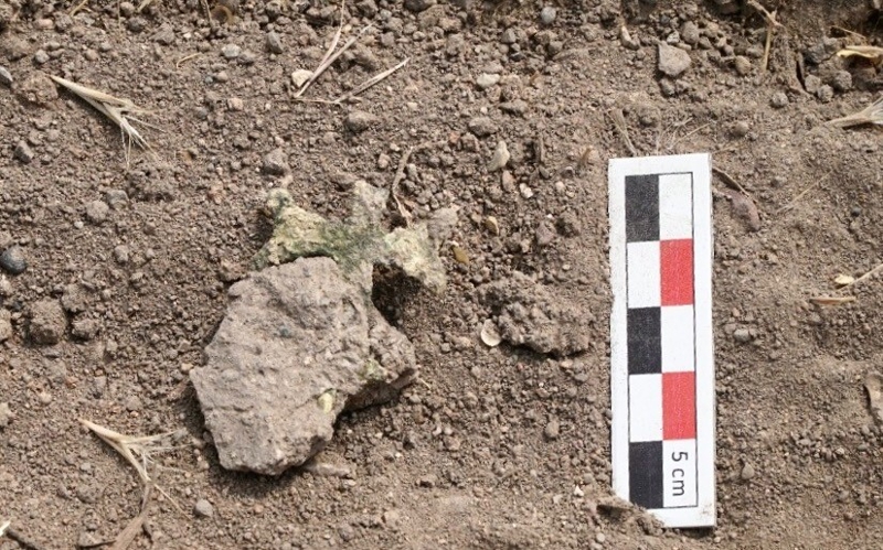 Bu buluntular içerisinde örneğin mezar kapaklarındaki erken dönem haç kazımaları görülüyor. Bunun yanı sıra yine erken dönem tarihinde diyebileceğimiz cam kandil parçaları, bunların da yanı sıra yine bunu teyit eden sikkeler ve mezarlık alanı çevresinde bulduğumuz bir takım objeler var. Buna örneğin bronz küpe ve bronz haç kolye ucundan bahsedebiliriz.