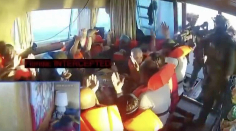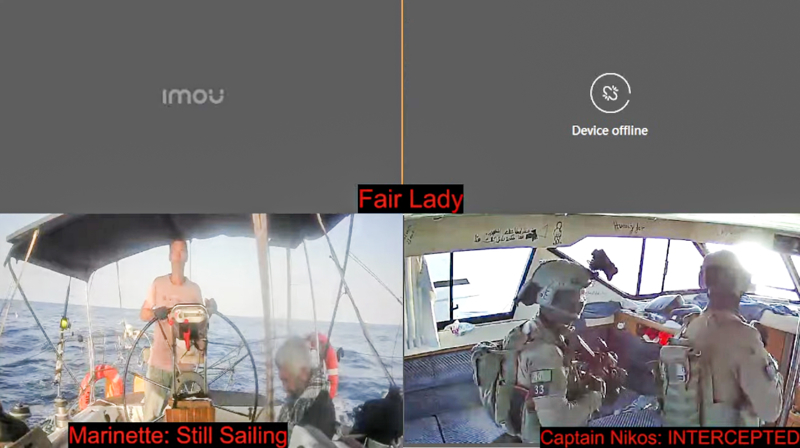 Filo'nun internet sitesinden aktarılan canlı yayında, Captain Nikos gemisindeki aktivistlerin alıkonulmasının ardından silahlı İsrail askerlerinin gemiye girdiği anlar paylaşıldı.