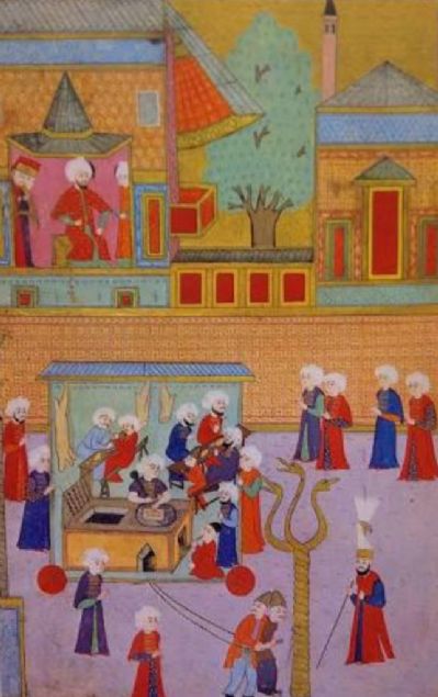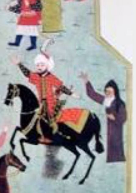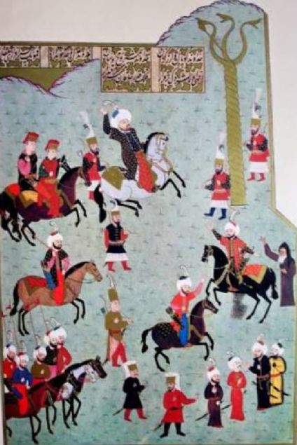 Fatih'in atadığı Patrik Gennaidos sahnede bir jest yapıyor ve bu sütunun şehri yılanlardan çıyanlardan koruduğuna sultanı ikna ediyor.