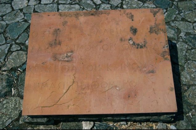 Kitabede Grek şair Simonides'in şu dizeleri var: Git Spartalılara söyle / Buradan geçen yabancı / Burada / Kanunlara itaat eden bizler yatıyoruz