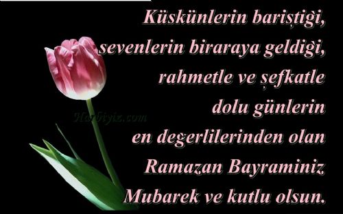 » Küskünlerin barıştığı, sevenlerin bir araya geldiği, rahmet ve şefkat dolu günlerin en değerlilerinden olan Ramazan Bayramınız kutlu olsun. » Bir bayram gülüşü savur göklere, eski zamanlara gülücükler getirsin, öyle içten öyle samimi, gözyaşlarını bile tebessüme çevirsin. İyi bayramlar!