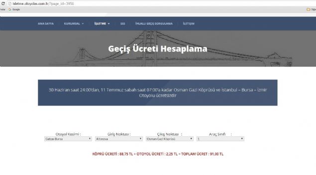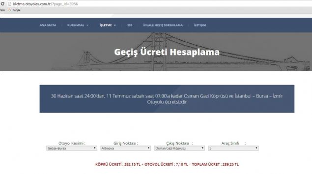 Otoyol, boğaz köprüleri ve Osmangazi Köprüsü'nden geçişler 11 Temmuz Pazartesi günü saat 07.00'ye kadar ücretsiz olacak. Osmangazi Köprüsü'nün yapımını üstlenen Otoyol A.Ş.'nin internet sitesinde araç sınıfları ve ücretleri belirtti. Buna göre tarife şöyle:
