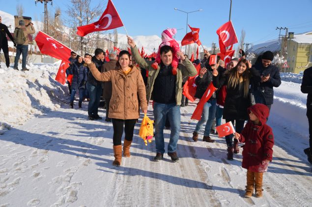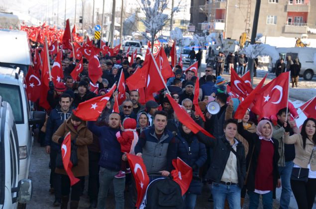 Hakkari'nin Yüksekova ilçesinde dondurucu soğuğa rağmen yaklaşık 3 bin kişi, ellerinde Türk bayraklarıyla terör örgütü PKK'nın saldırılarını protesto etti.