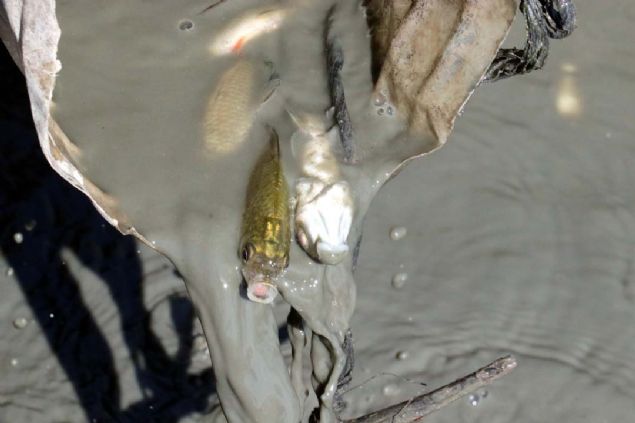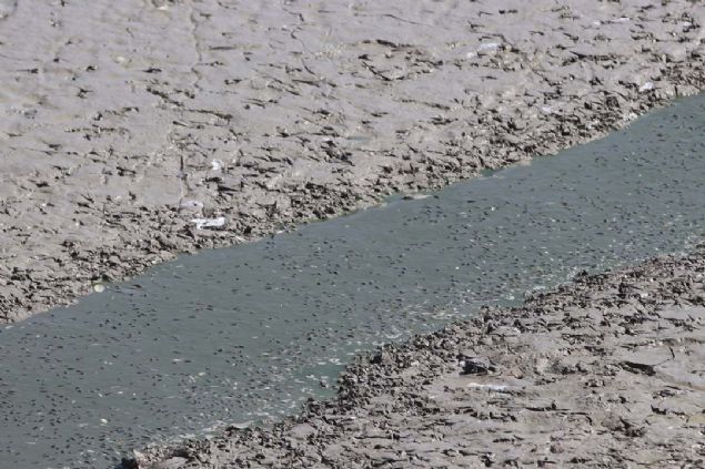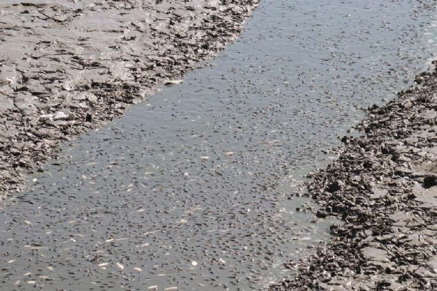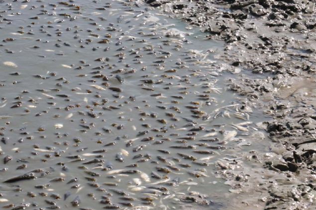Suyun azalması üzerine göldeki birçok balık telef oldu, bazıları balçığa saplandı.