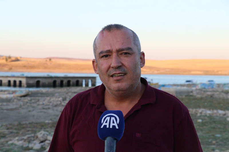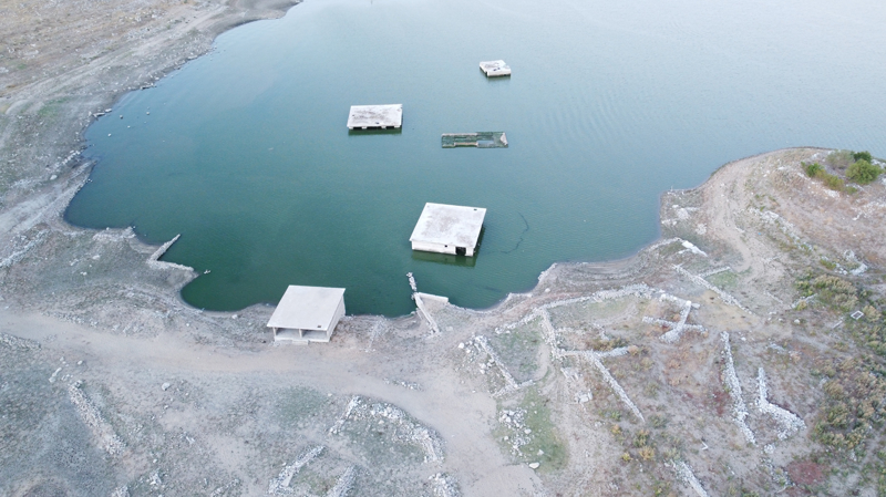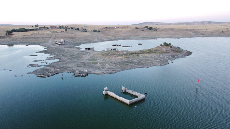 Kuraklık nedeniyle su seviyesinin düştüğü barajda eski yerleşim yeri ortaya çıktı.