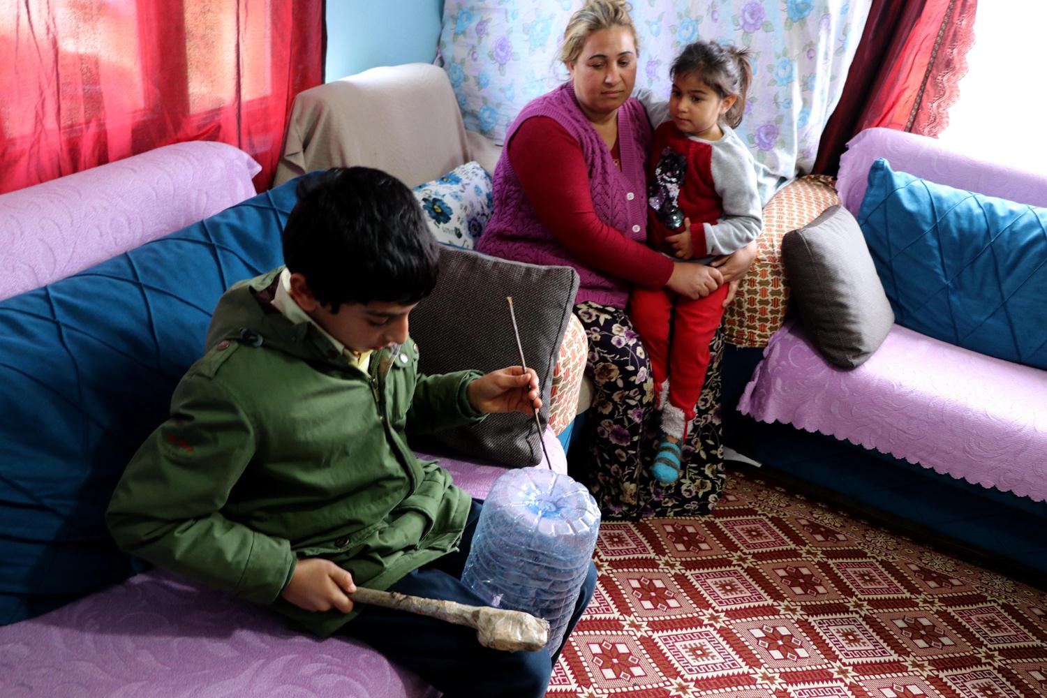 Okuldan arta kalan zamanda atölyede çalışan "minik davulcu" evinde de bidonla ritim tutuyor.