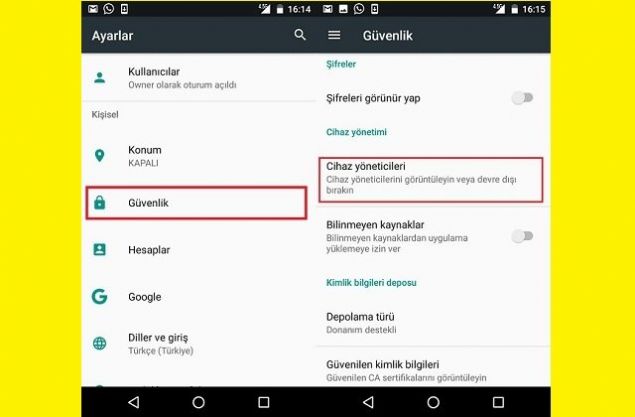 Kaldır seçeneğini göremiyorsanız Ayarlar sekmesinden Güvenlik ve Cihaz Yöneticisi yolunu takip etmeli ve yandaki onay işaretini kaldırmalısınız.