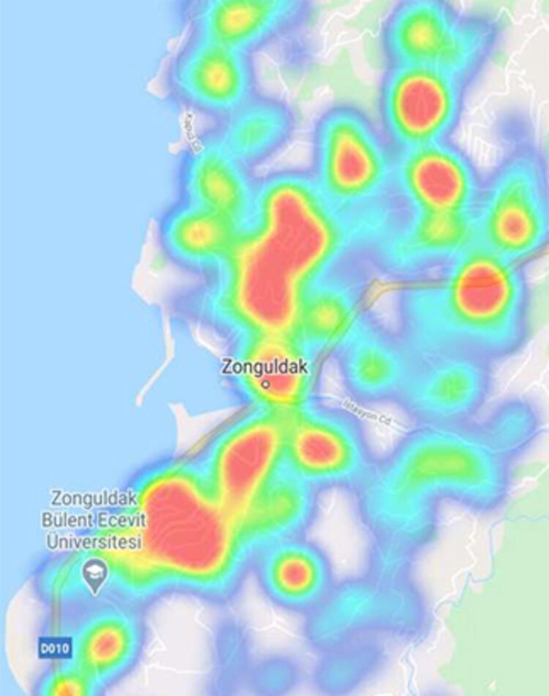 Bu uygulamadaki Türkiye koronavirüs haritasında, enfekte kişiler ve riskli bölgelerin yoğunluğu görülebiliyor.