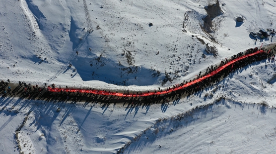 Kars merkez ve Sarıkamış ilçesinden otobüslerle zirveye ulaşan vatandaşlar, ellerinde Türk bayraklarıyla yürüyerek toplanma alanına ulaştı.