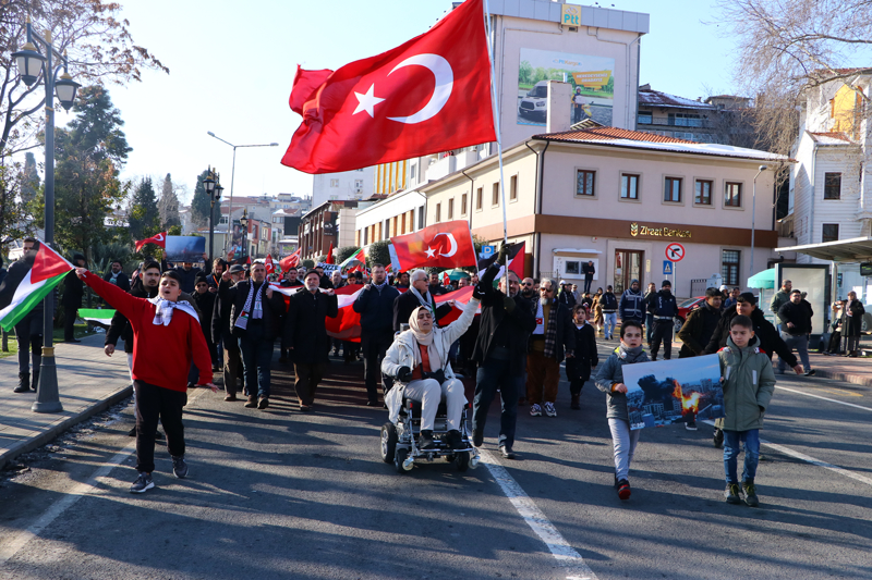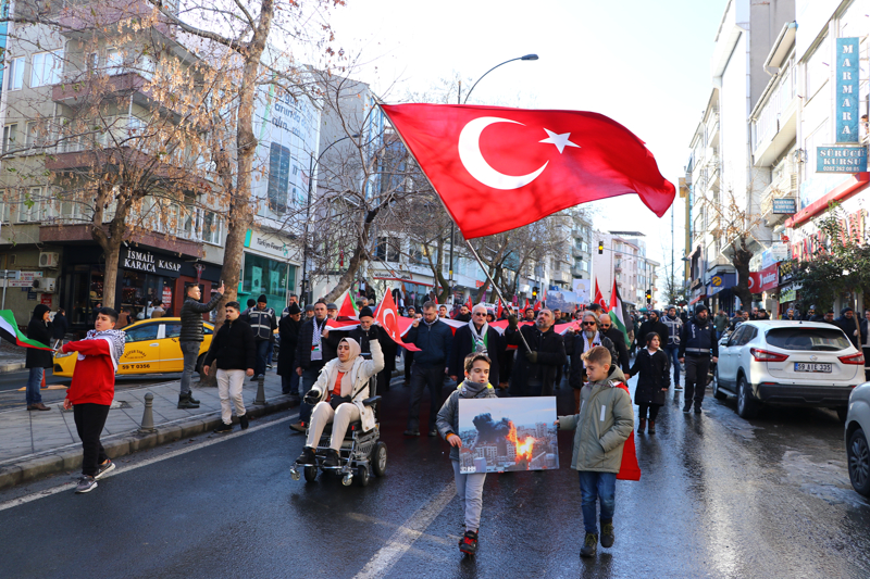 Tekirdağ'da İsrail'in Gazze'ye yönelik saldırıları ve terör protesto edildi. Köprübaşı mevkisinde bir araya gelen STK üyeleri Türk ve Filistin bayraklarıyla Hükümet Caddesi'nden valilik önüne kadar slogan atarak yürüdü.