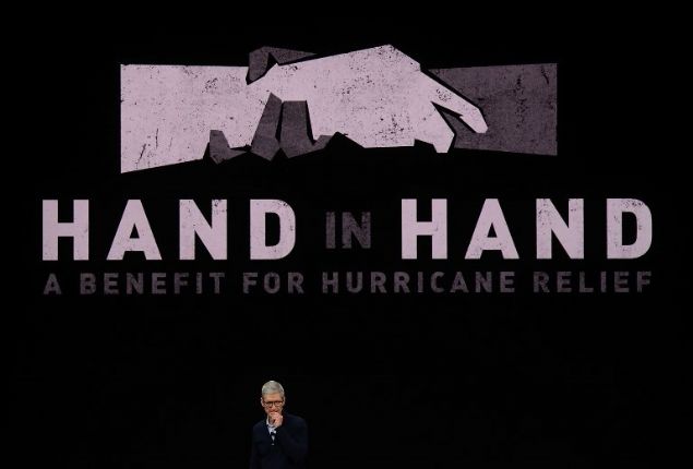 Gecede Harvey ve Irma kasırgalarının kurbanlarını da anan Apple CEO'su Tim Cook'un konuşması sırasında Steve Jobs'un yer aldığı bir görüntü yansıtıldı.