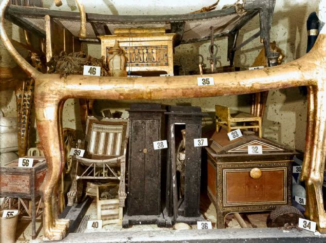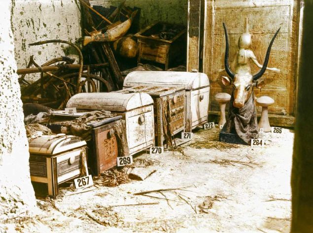 Tutankamon’un mezarı iki odadan ve ilk odaya inen bir merdivenden oluşuyordu. İlk odada bir at arabası, Tutankamon’un tahtı ve bunlar gibi Tutankamon’un hayattayken kullandığı paha biçilemez eserler bulundu.