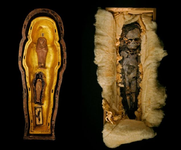 Tutankhamun’un mezarında en az yedi aylık gebelik sürecine ait bir fetüs (sağda) ile daha ufak ve kırılgan bir fetüs bulundu. Biri veya her ikisi birden kralın kızları olabilir. Birlikte yerleştirilmiş tabutlarda (solda) Tutankhamun’un büyükannesi Tiye’ye ait olabilecek bir tutam saç bulundu.