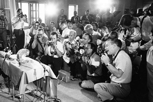 Able ve Baker Uzaya yaptıkları ilk yolculuktan sağ çıkmayı başaran iki maymun, Able ve Baker, NASA’nın basın toplantısında kameralara poz veriyor.