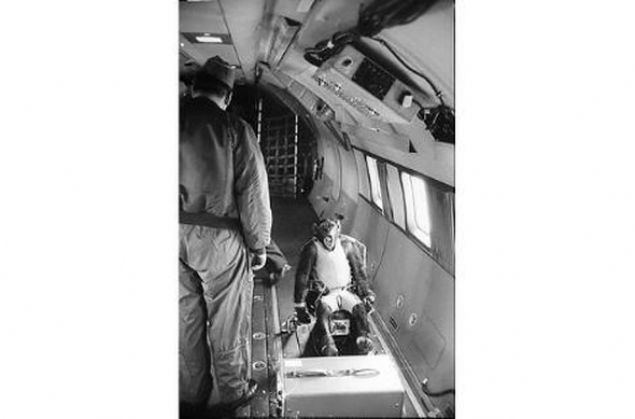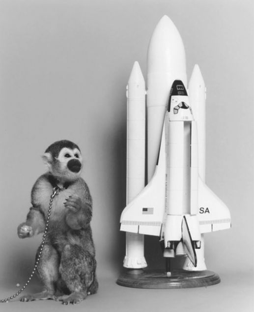 Küçük Adam Resimde, katılacağı uzay uçuşundan önce yapılan eğitim alıştırmaları sırasında kapsüle bağlanmış bir sincap maymunu görülüyor.