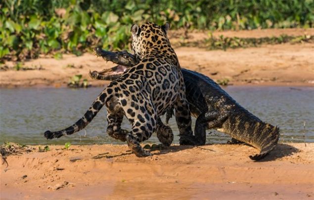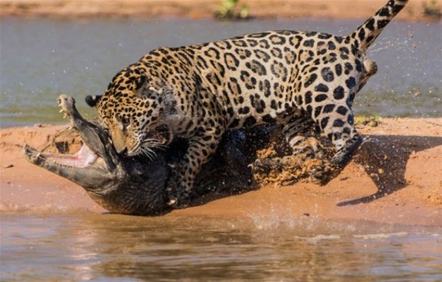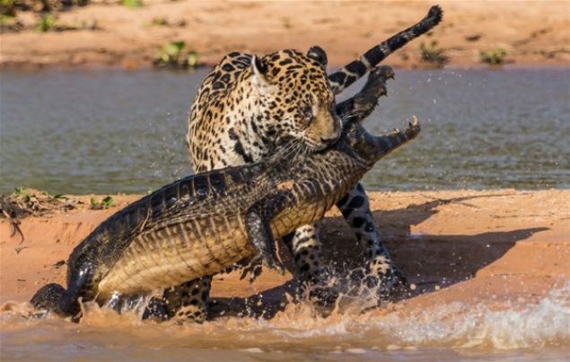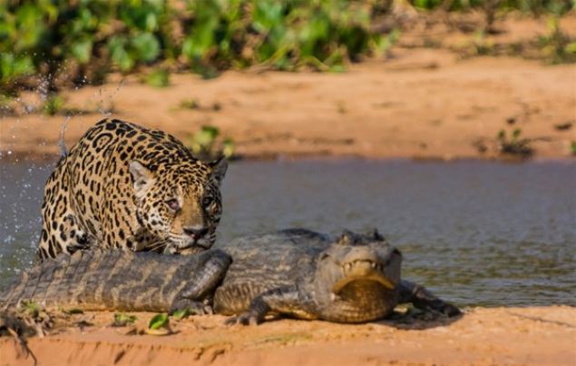 Ava çıkan bir jaguar gözüne timsahı kestiriyor.