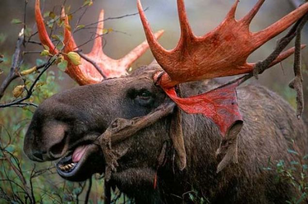 Boynuzlarından dökülen kadifemsi parçaları yiyen geyik.