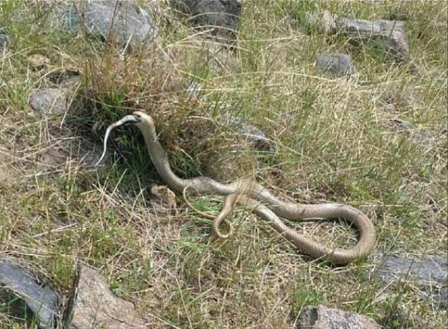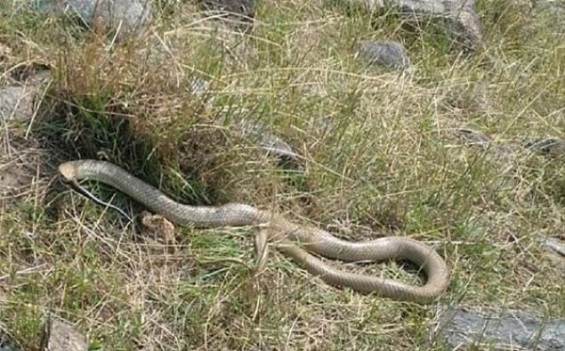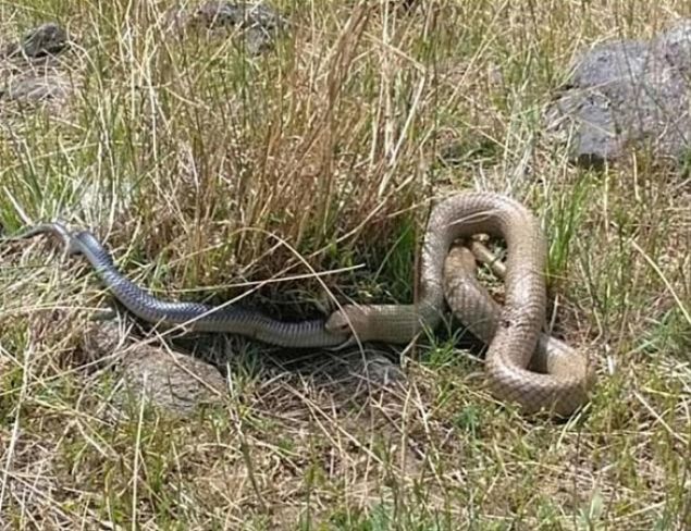 Kahverengi bir yılanın siyah bir yılanı yeme anını kaydeden çiftçi daha önce böyle bir olayla karşılaşmadığını dile getirdi.